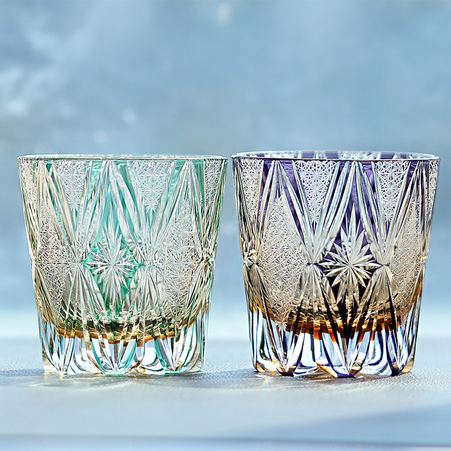 Hand blown and Hand Engraved Pattern Color tinted Glass Tumblers/Color overlaid Glass tumblers