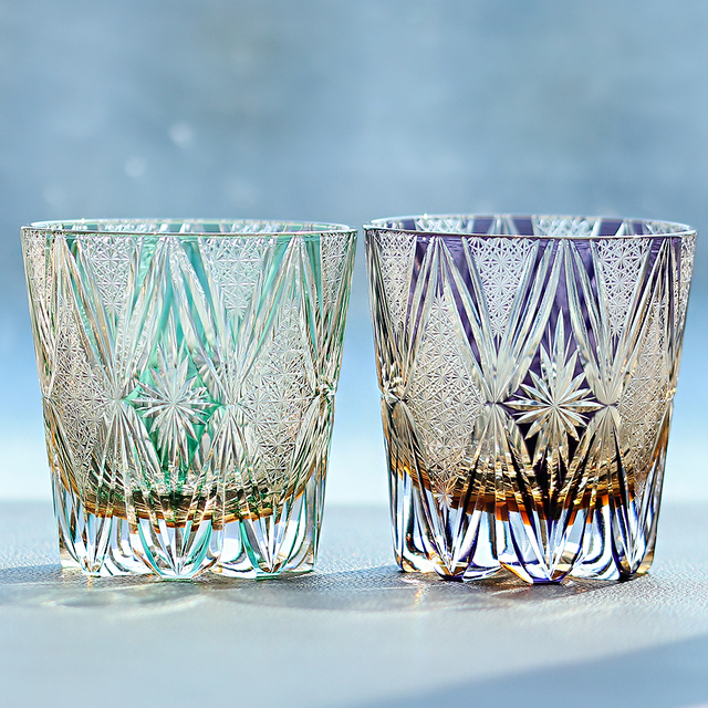 Hand blown and Hand Engraved Pattern Color tinted Glass Tumblers/Color overlaid Glass tumblers